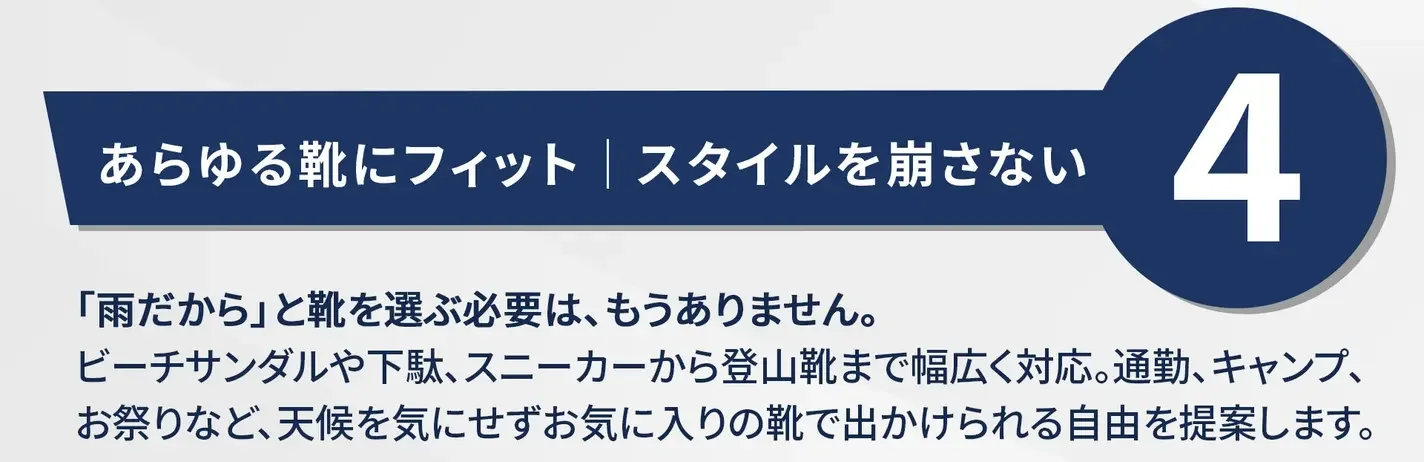 足元が濡れてしまうと、その後のムレ・ニオイ・靴擦れといった不快感だけでなく、体温の低下や気分の落ち込みにも繋がります。靴下を履き替えたり、予定を切り上げたりせざるを得ないこともあるでしょう。